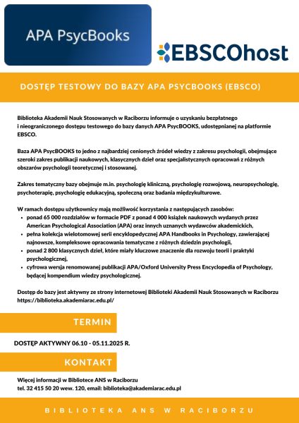 Biblioteka Akademii Nauk Stosowanych w Raciborzu informuje o uzyskaniu bezpłatnego i nieograniczonego dostępu testowego do bazy danych APA PsycBooks, udostępnianej na platformie EBSCO. Baza APA PsycBooks to jedno z najbardziej cenionych źródeł wiedzy z zakresu psychologii, obejmujące szeroki zakres publikacji naukowych, klasycznych dzieł oraz specjalistycznych opracowań z różnych obszarów psychologii teoretycznej i stosowanej. Zakres tematyczny bazy obejmuje m.in. psychologię kliniczną, psychologię rozwojową, neuropsychologię, psychoterapię, psychologię edukacyjną, społeczną oraz badania międzykulturowe. W ramach dostępu użytkownicy mają możliwość korzystania z następujących zasobów: