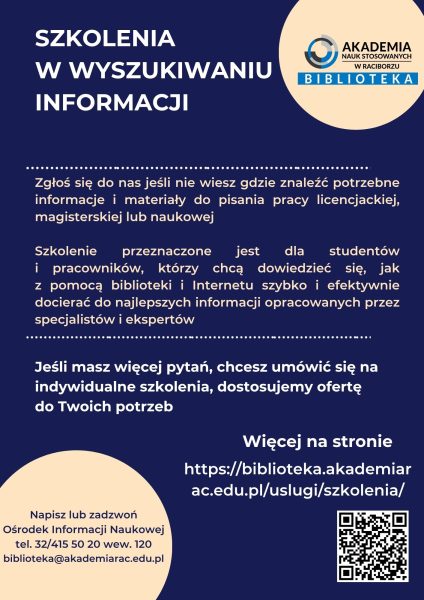 Biblioteka Akademii Nauk Stosowanych w Raciborzu zaprasza wszystkich studentów oraz pracowników Uczelni na szkolenia w wyszukiwaniu informacji.