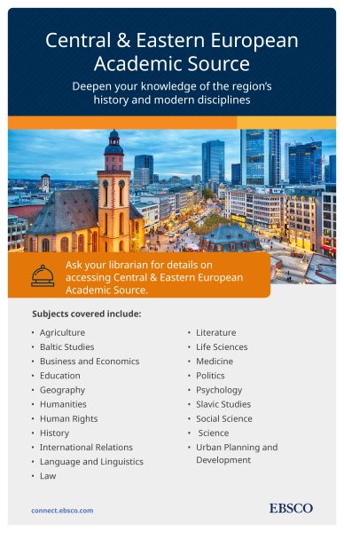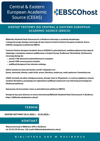 Biblioteka Akademii Nauk Stosowanych w Raciborzu informuje o uzyskaniu bezpłatnego i nieograniczonego dostępu testowego do bazy danych Central & Eastern European Academic Source (CEEAS), dostępnej na platformie EBSCO.